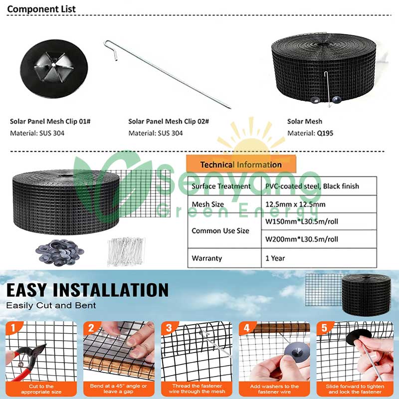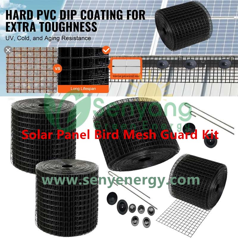 Комплект сетчатой защиты от птиц для солнечных батарей изготовлен из оцинкованной стальной проволоки, сваренной в сетку и покрытой ПВХ-покрытием, что обеспечивает прочность, стабильность и устойчивость к ржавчине. Она служит в качестве защитного барьера для предотвращения птиц и других мелких животных. Подходит для различных защитных нужд.