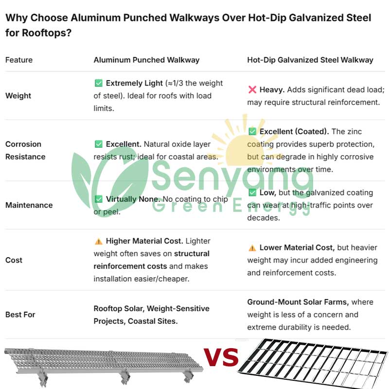 For rooftop solar installations, the Aluminum Punched Solar Walkway is often the superior choice. Its lightweight nature protects the building’s structure, its durability protects the roof membrane, and its anti-slip design protects personnel. While the upfront material cost is higher than steel, the total installed cost and long-term benefits for roof integrity and safety make it a smart, value-adding investment for any commercial or industrial rooftop solar project.